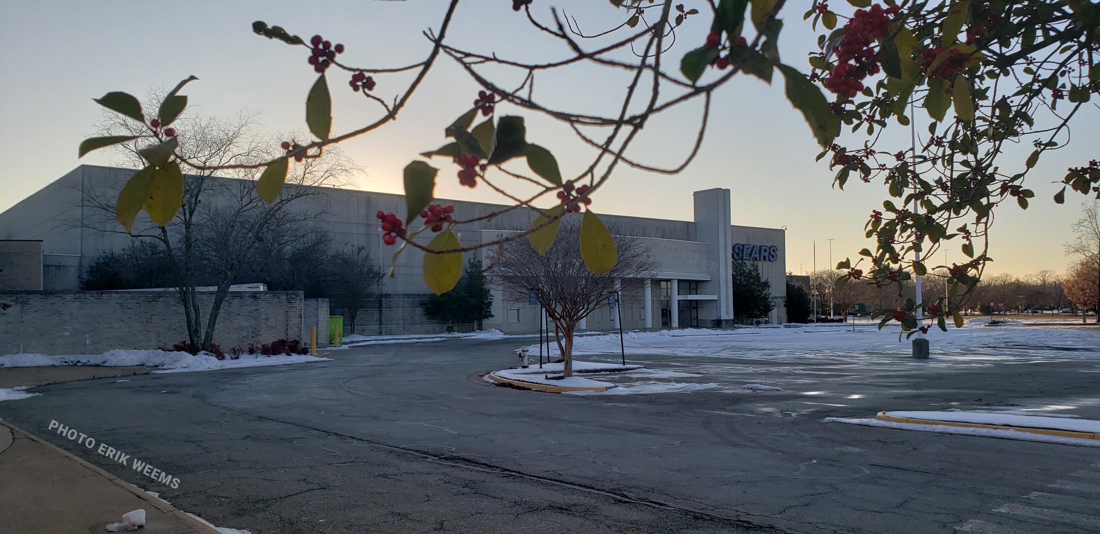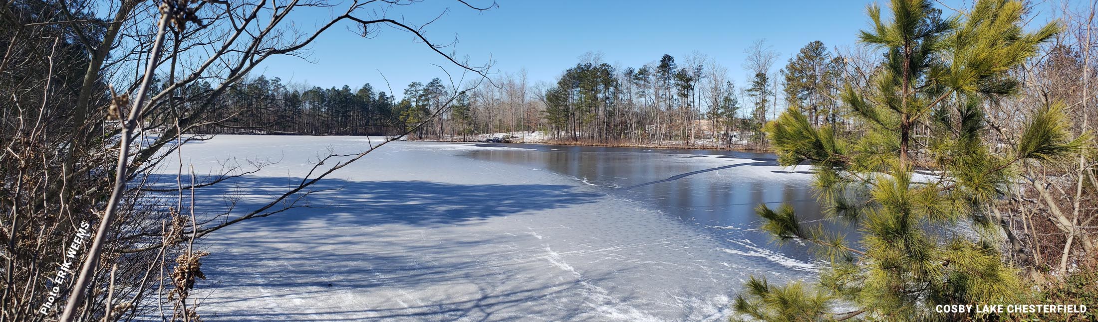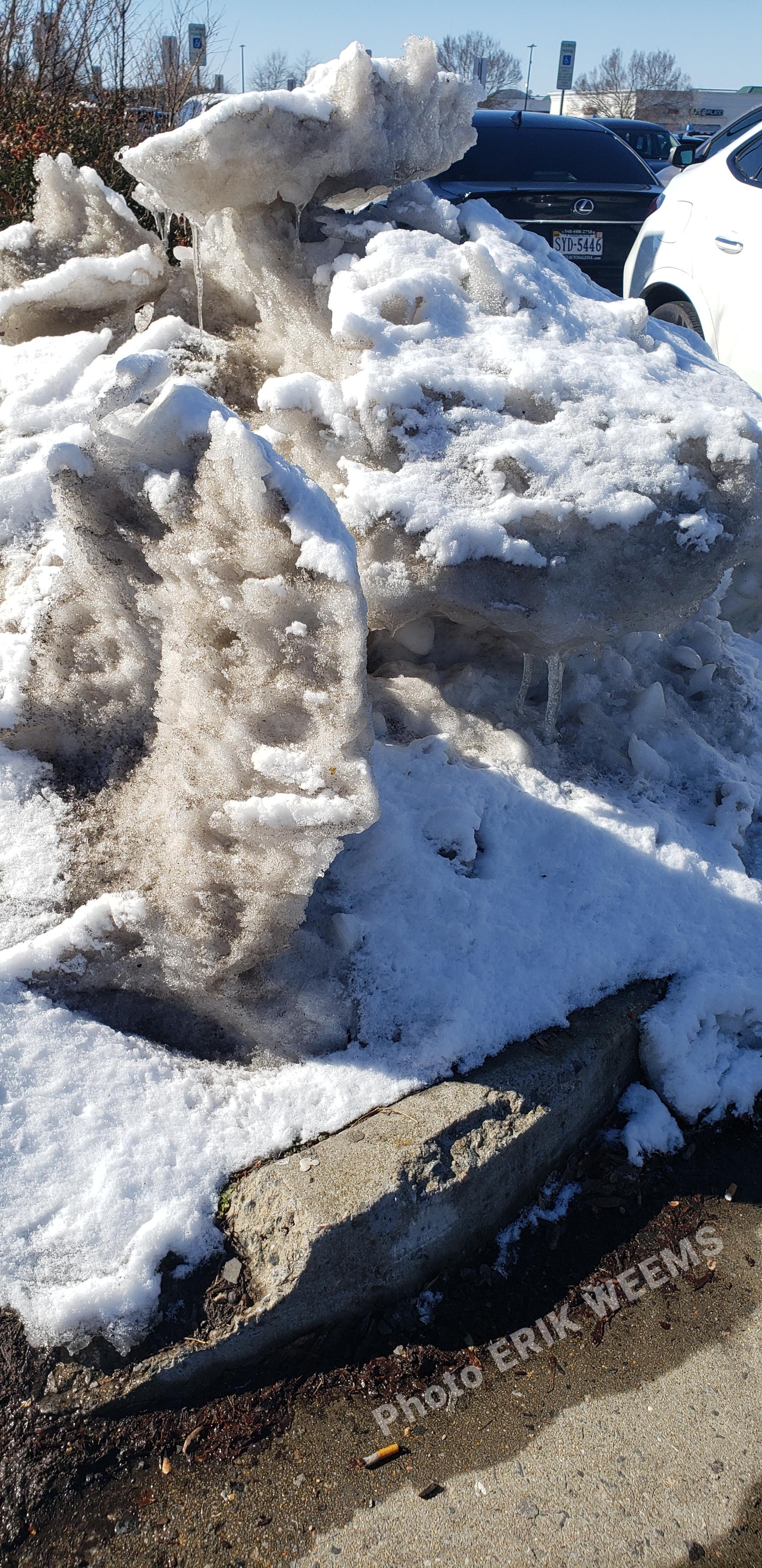 Dirty snow and ice piled up like abstract sculpture along Iron Bridge Road in Chesterfield near the gov't buildings